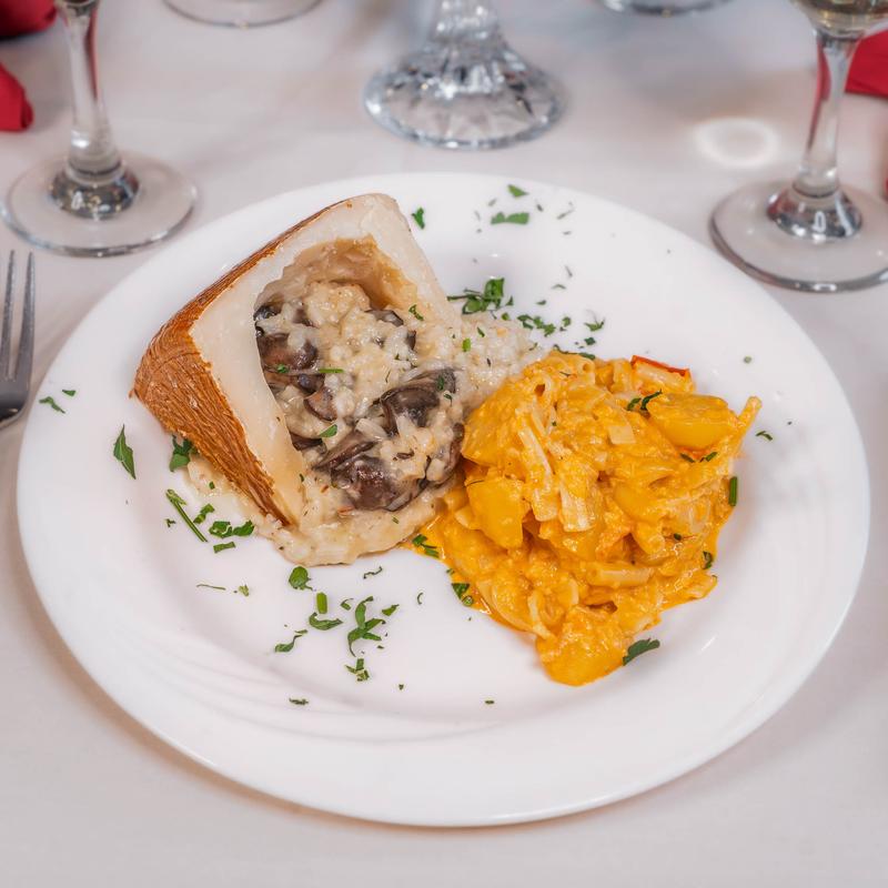 Served with potato purée and sweet and sour onions