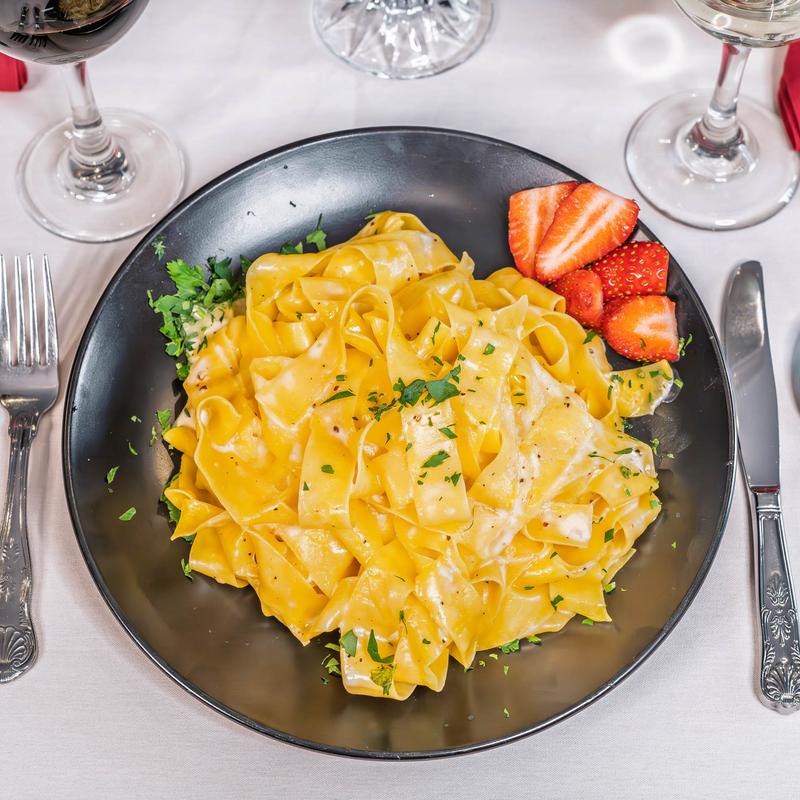 Pappardelle pasta tossed in our creamy cheese sauce